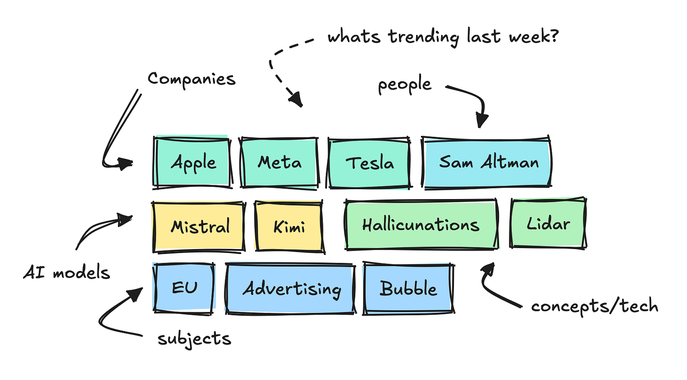 It ingests thousands of texts from tech forums and websites per day and uses small NLP models to break down the main keywords, categorize them, and analyze sentiment.