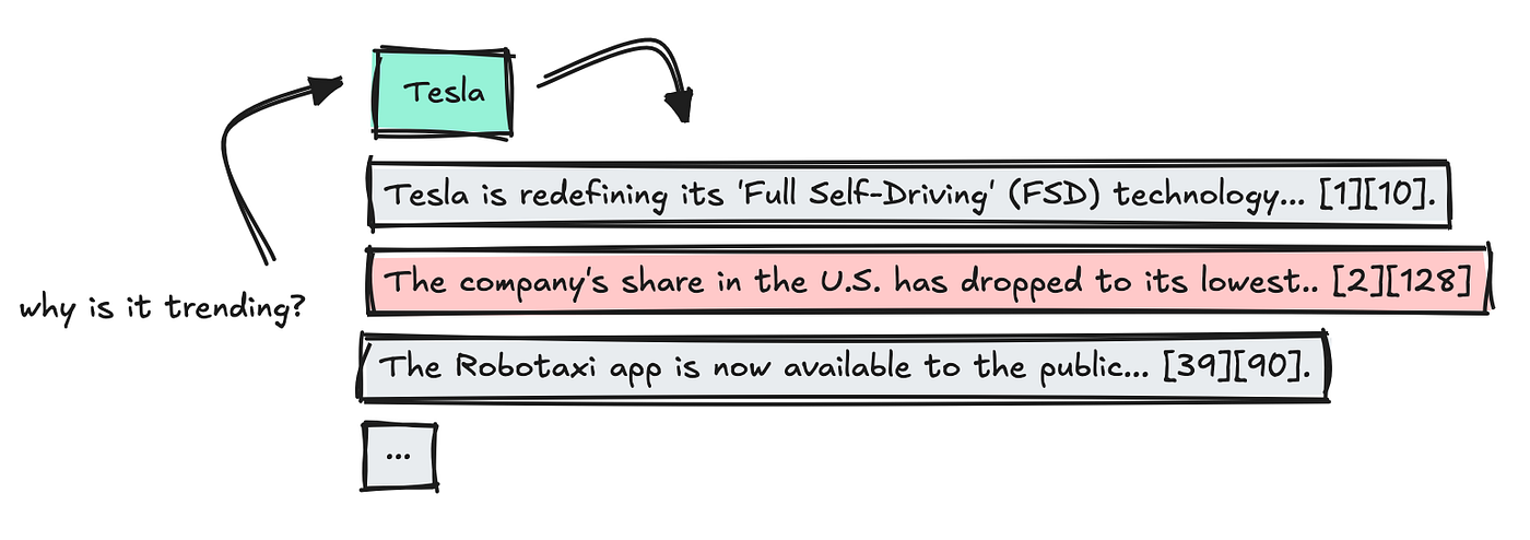This endpoint receives a keyword and a time period, and the system sorts comments and posts by engagement. Then it process the texts in chunks with smaller models that can decide which “facts” to keep.