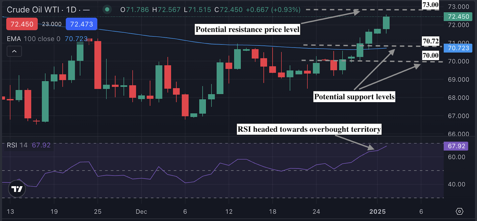 At the start of 2025, Oil is edging up at around $72.45 with upward bias evident on the daily chart. However RSI rising towards