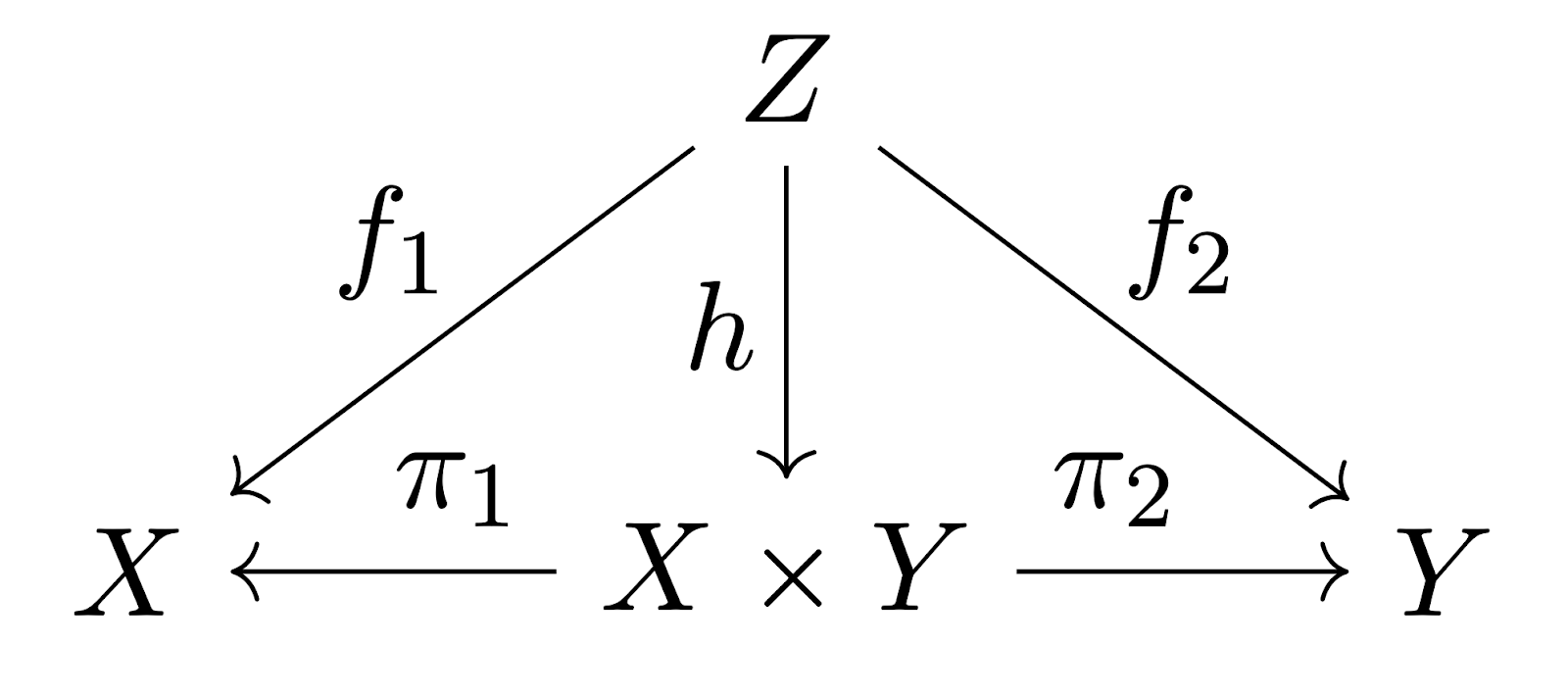 Determine 5: The commutative diagram that describes a product $X occasions Y$. For any $Z$ with maps $f_1: Z rightarrow X$ and $f_2: Z rightarrow Y$, there exists a novel map $h: Z rightarrow X occasions Y$ such that $f_1 = pi_1 circ h$ and $f_2 = pi_2 circ h$ the place $pi_1$ and $pi_2$ are the standard projection maps from $X occasions Y$ to $X$ and $X occasions Y$ to $Y$ respectively.